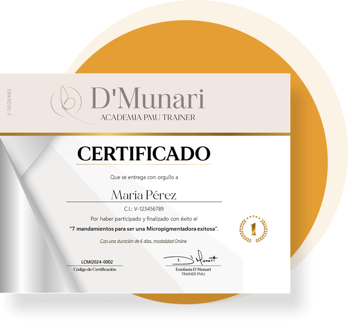 Al completar el ebook «los 7 mandamientos para ser una micropigmentadora exitosa» de la academia D´Munari, accederás de manera inmediata y sin costo adicional, a un certificado personalizado que avalará tus conocimientos.